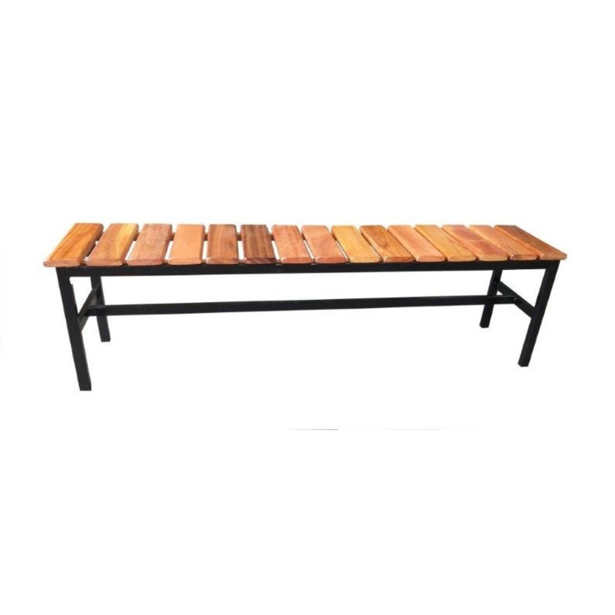 Assento produzido com sarrafos de madeira maciça, cada um medindo 9 cm de largura x 2 cm de espessura. Madeira natural com acabamento em verniz. Estrutura formada por tubos de aço carbono de seção retangular 30 x 20 mm x 1,20 mm de espessura.