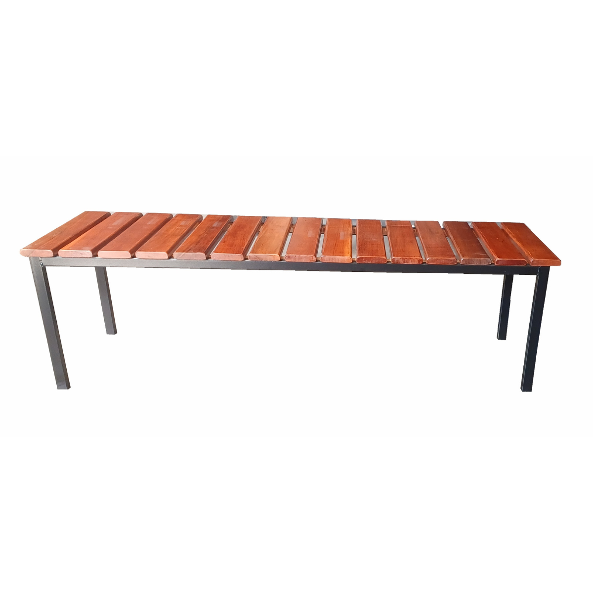 Banco com assento produzido com sarrafos de madeira maciça, cada um medindo 9 cm de largura x 2 cm de espessura. Madeira natural cedrinho, com acabamento em verniz. Estrutura fabricada com tubos de aço carbono de seção 30 x 20 mm x 1,20 mm de espessura. Pintura da estrutura em epoxi pó nas cores: preto texturizado ou cinza claro.