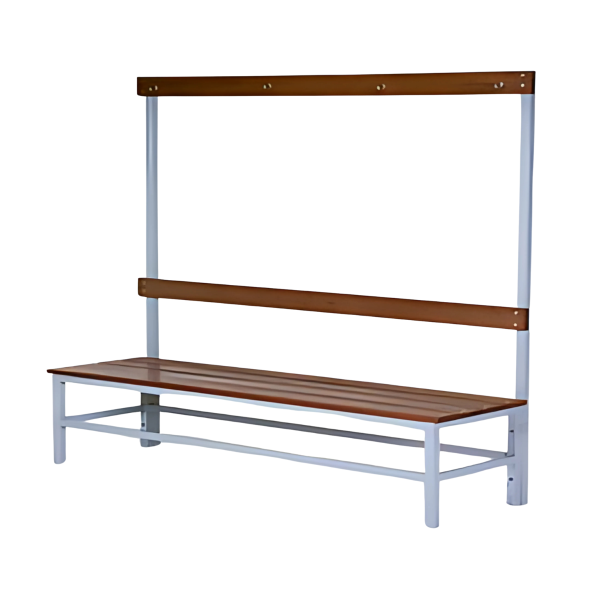 Banco para vestiário com encosto Assento, encosto e cabideiro, produzidos com sarrafos de madeira maciça, cada um medindo 9 cm de largura x 2 cm de espessura.