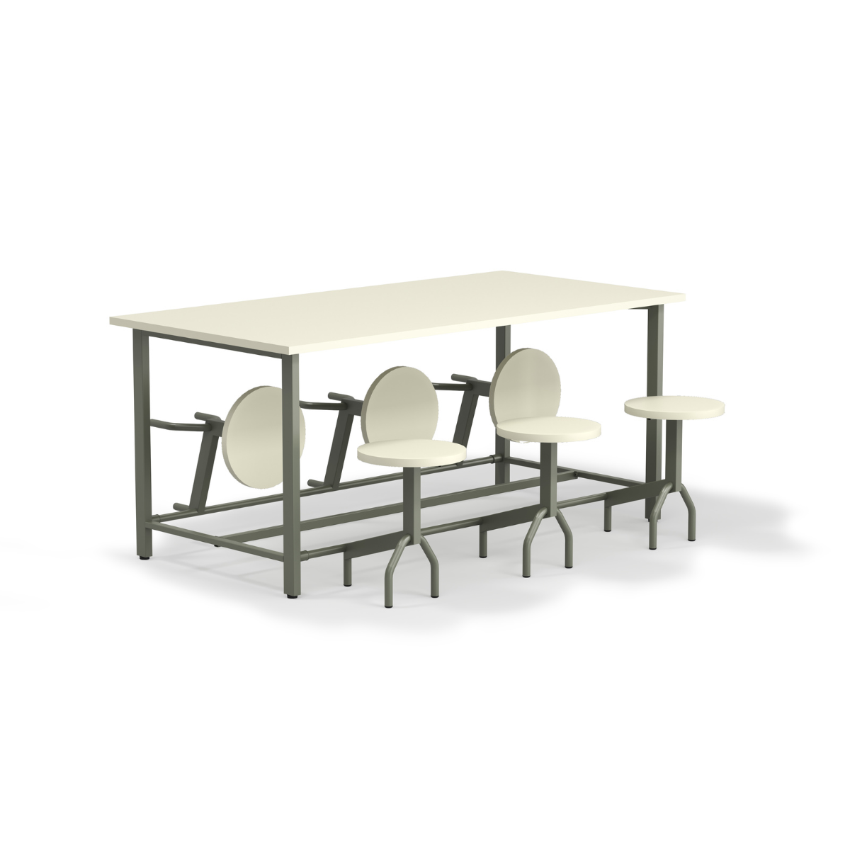 A mesa com bancos acoplados e escamoteáveis garantem mais organização. Seu design facilita a limpeza do espaço e otimiza a circulação, tornando o dia a dia mais prático sem abrir mão do conforto.